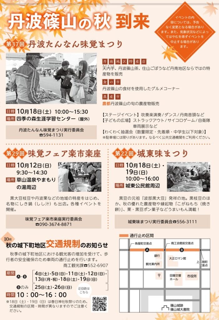 毎年10月初旬に、篠山城三の丸広場では「味まつり」が開催され、丹波篠山黒枝豆、丹波栗、猪肉、丹波篠山牛などを一同に集めて販売し、3日間で10万人近くの観光客が丹波篠山へお越しになりました。味まつりの時期になると、丹南篠山口IC出口付近が大渋滞となる様子は「秋の風物詩」となっていました。
