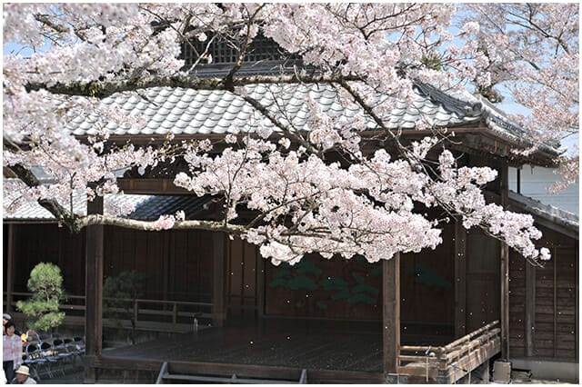 With the arrival of the Meiji period, Noh performances at the Kasuga Shrine stage became rare. Eventually, the stage was no longer used for its intended purpose. However, dedicated local volunteers made tireless efforts to revive the Noh performances at Kasuga Shrine. Thanks to their passion, the first Sasayama Kasuga Noh was held in 1973 (Showa 48). Despite a few interruptions over the years, the event has been held almost annually. In 2025 (Reiwa 7), the Sasayama Kasuga Noh reached its 50th performance milestone. In addition, “Gancho-noh” (New Year’s Day Noh) is held annually on January 1st, where the ritual play “Okina” is dedicated to the shrine to pray for peace and prosperity. Currently, Noh performances are held twice a year at the Kasuga Shrine stage. Under the swirling cherry petals, the subtle and profound world of Noh and Kyogen—a tradition spanning over 150 years since the stage’s construction—will unfold.